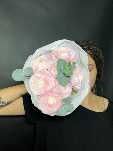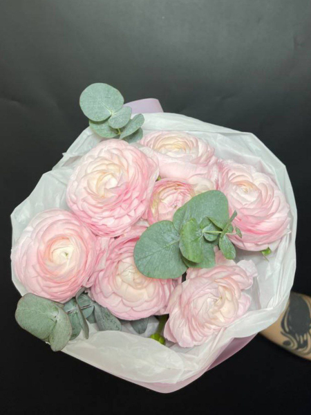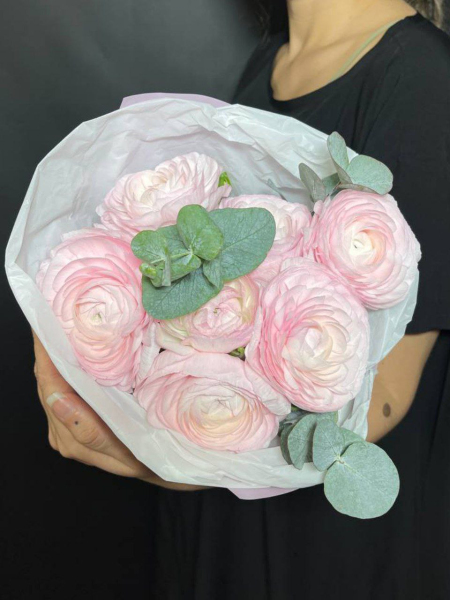 Нежный и изысканный букет, состоящий из 7 роскошных розовых ранункулюсов и 3 веточек эвкалипста станет идеальным дополнением к любому празднику или событию. Эти цветы символизируют свежесть и нежность, поэтому подарить такую композицию – значит выразить свои самые теплые чувства.