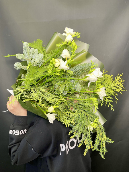 Зимний букет из живых веток пихты Нобилис с белоснежной фрезией